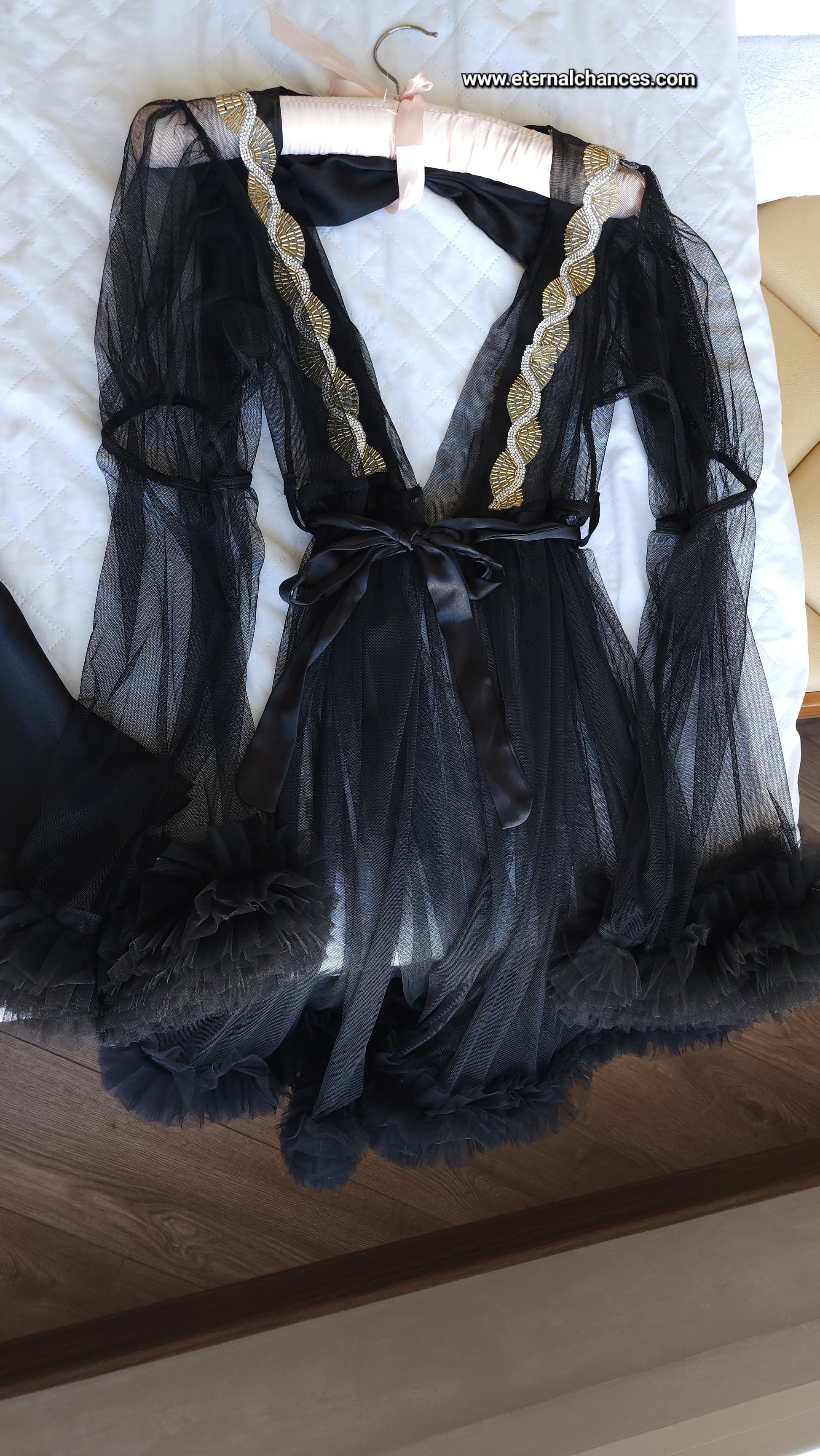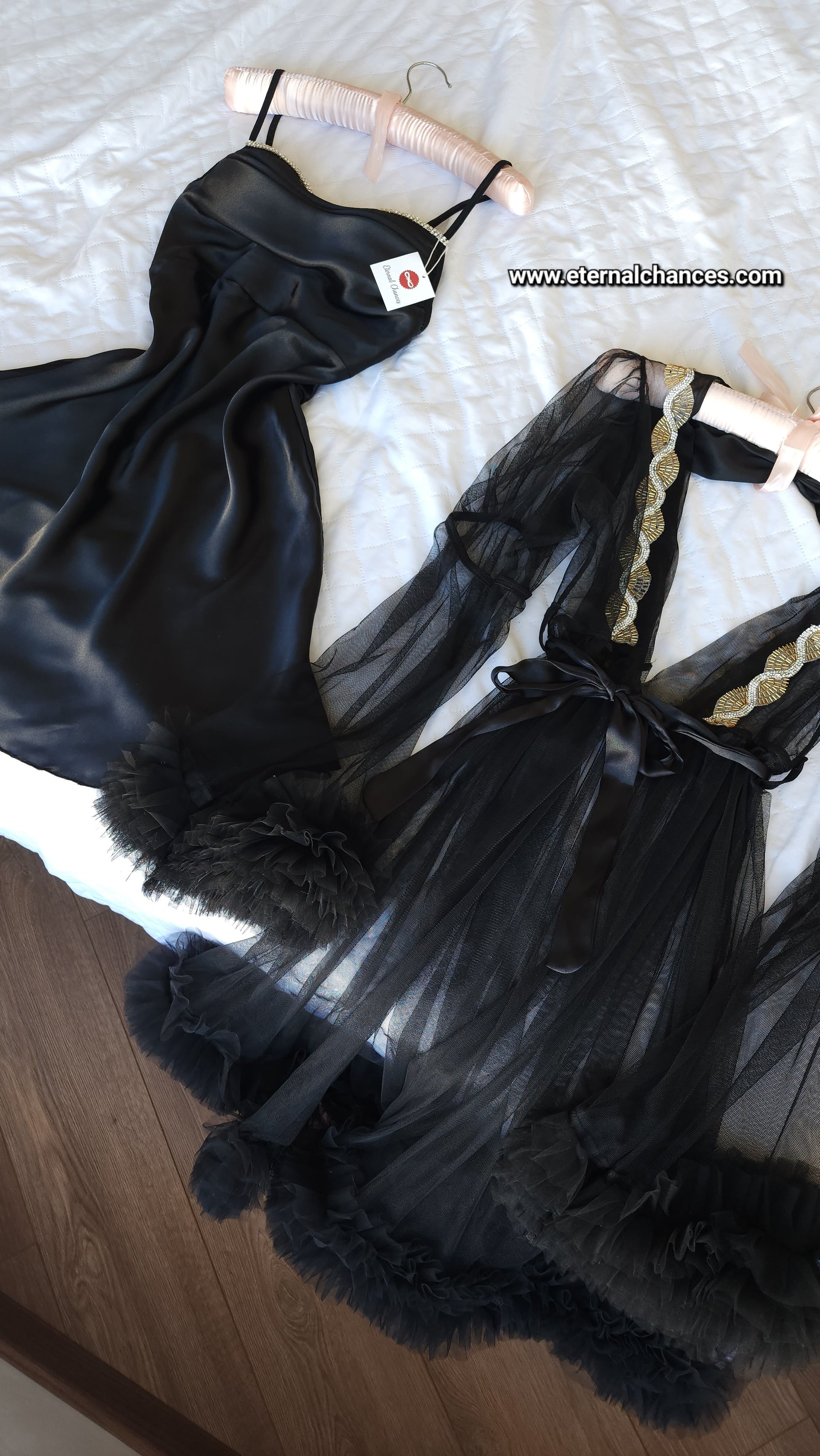 Ensemble Court Mariée nuisette + déshabillé Glamour – Satin Noir & Tulle Transparent Taille unique standard